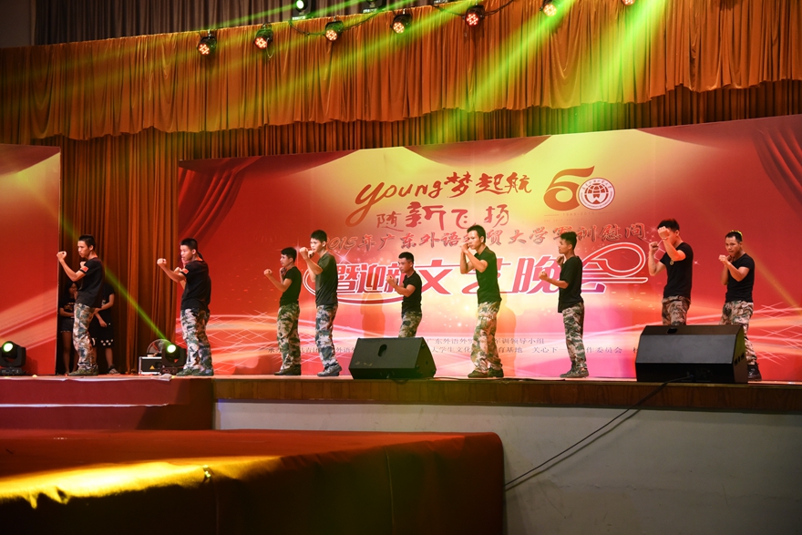 本网讯 9月25日和27日两个晚上,2015年军训慰问暨迎新文艺晚会分别在在北校区、南校区体育馆举行。晚会由伟德bv国际体育军训领导小组主办,校艺术团体、校团委等单位承办,以“young梦起航,随新飞扬”为主题,吹响“梦起”、“筑梦”和“起航”的号角,向15级新生展示了“广外梦”的美好。
