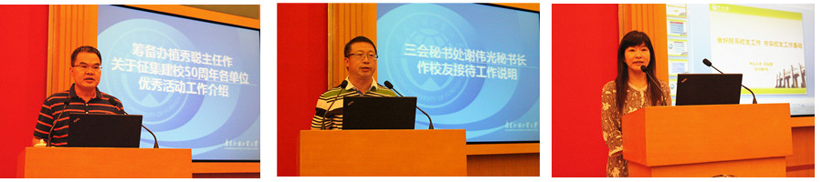 筹备工作办公室主任植秀聪在会上作关于征集建校50周年各单位优秀活动工作的介绍,鼓励各单位发挥才能、提炼特色,办好活动,积极申报建校50周年优秀活动。联络筹资组组长谢伟光作建校50周年主体活动举办期间的学院校友接待工作说明,明确了校友邀请、校友接待、志愿者培训、学院院史整理等工作安排。