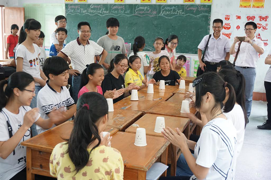 队员与学生合作展示杯子舞