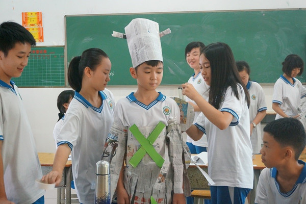 艺术课老师引导大家用废纸制作环保时装,让学生们亲手设计、制作属于自己的时装,课堂气氛相当活跃。学员们都发挥自己丰富的想象力,整个小组通力合作,为最后的环保时装秀作充分准备。
