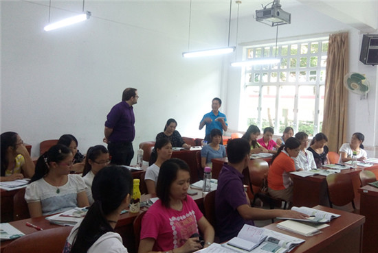 本期培训班的课程根据阳山县教育局的需求量身设计,十天的培训课程围绕英语听说能力、英语教学法、自我情绪调整三个模块进行,以外教Tim的英语口语课程为主,辅以两位中教的口语活动、《自然拼读与小学英语教育》、《视频在中小学教学中的作用》、《语法教学》等教学课程,课堂气氛轻松活泼,内容丰富,深受学员们欢迎。