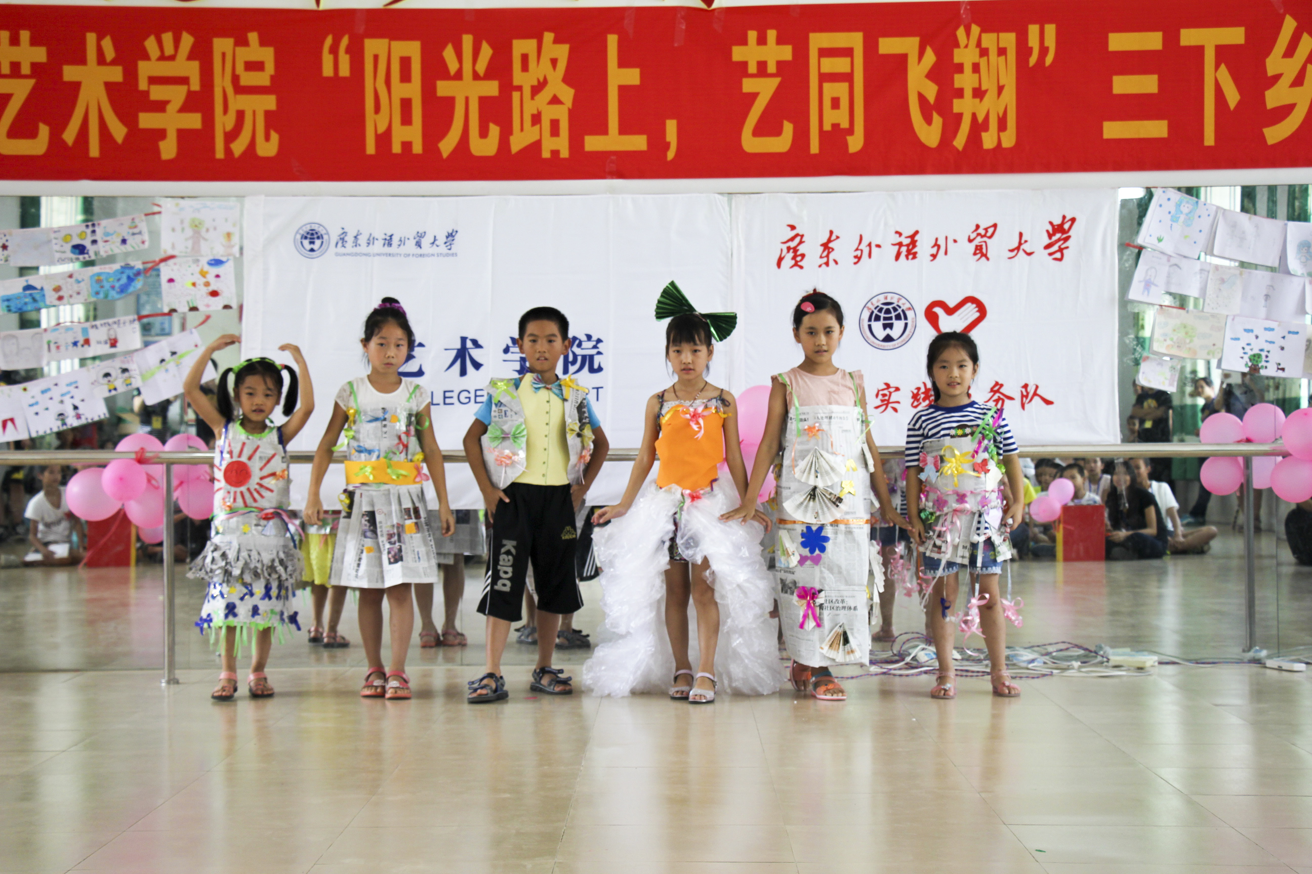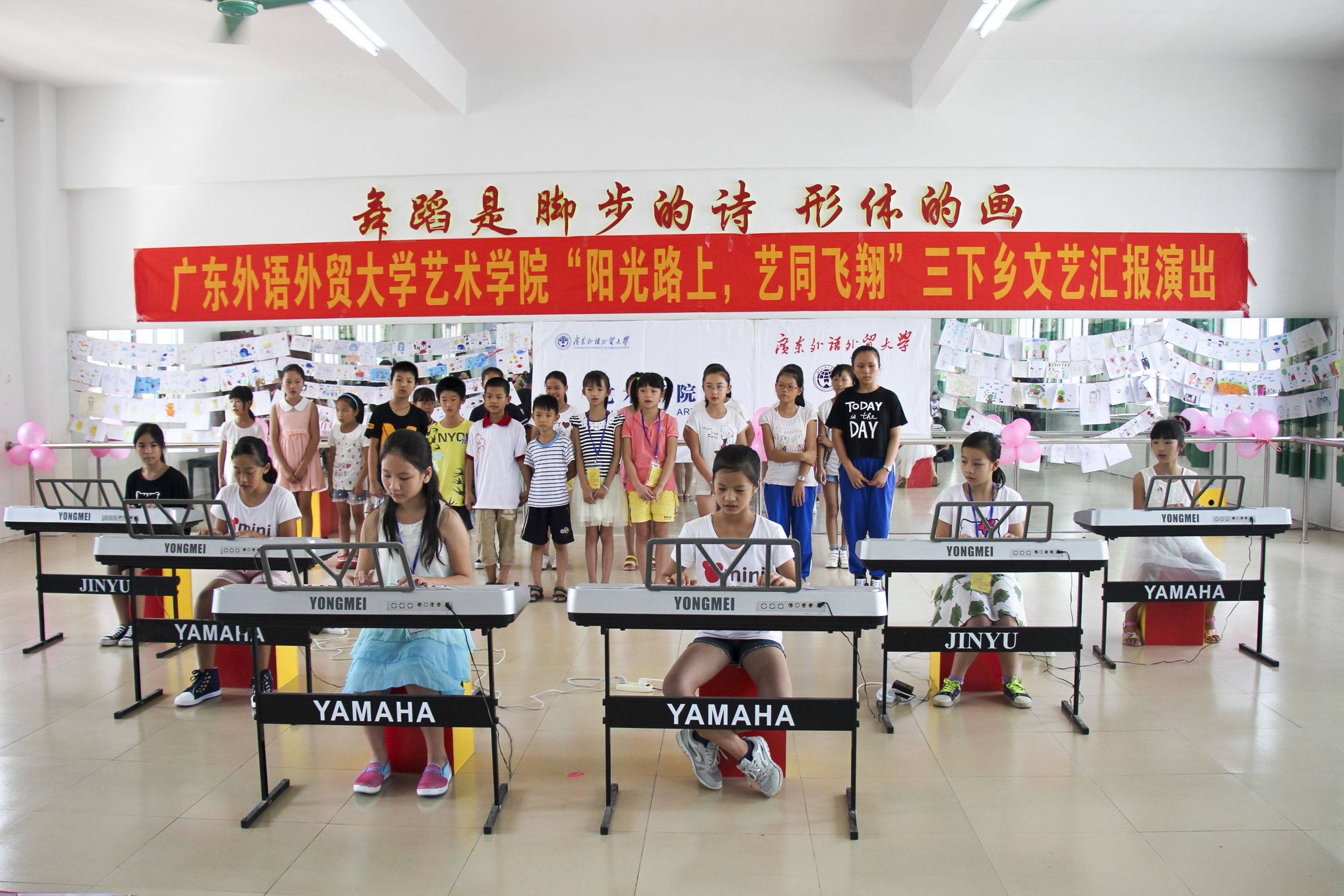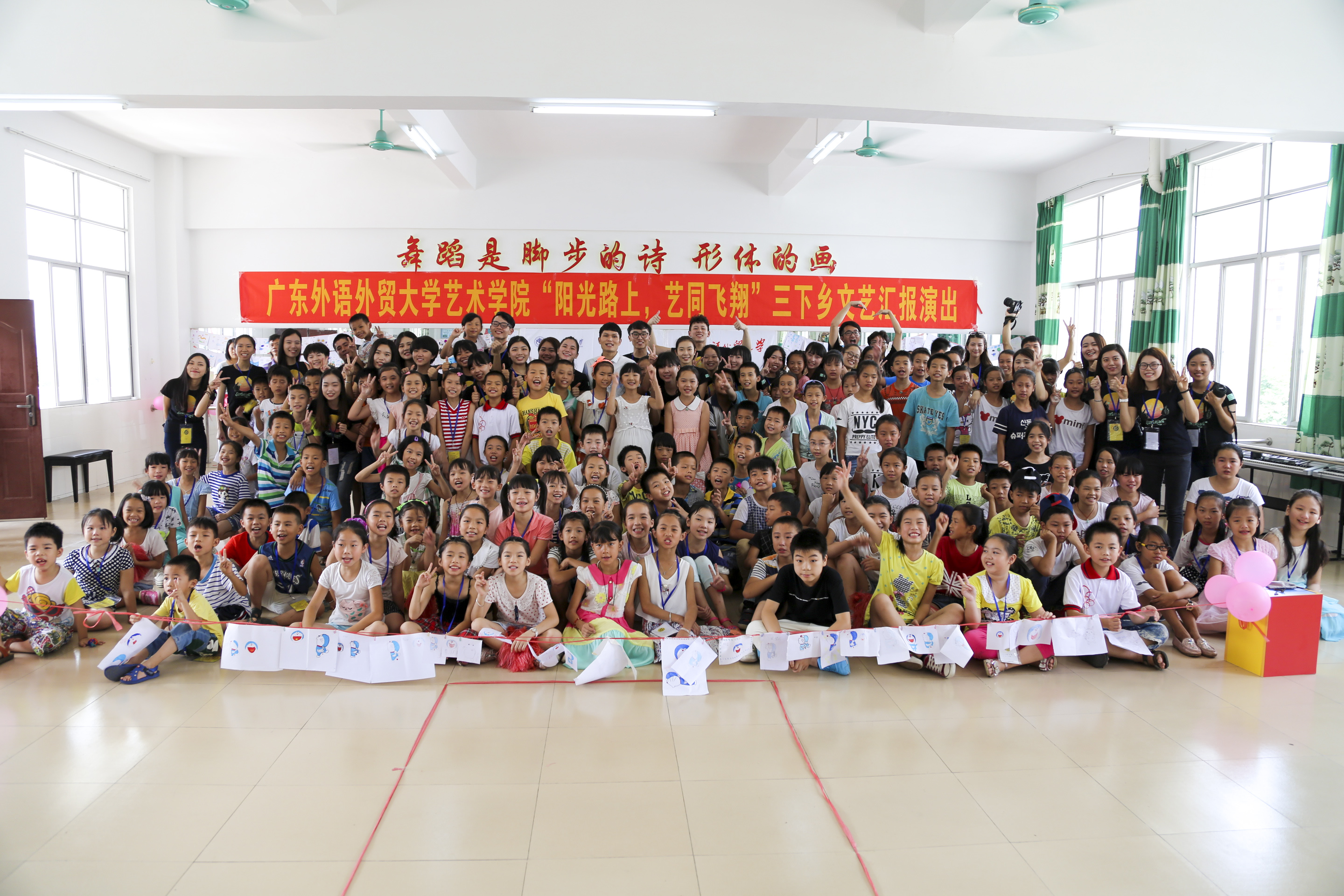 本网讯 8月1日上午,艺术学院“阳光路上,艺同飞翔”三下乡文艺汇报演出在英红镇中心小学隆重举行。英红镇中心小学副校长林先富、李传星,少先队辅导员张汝梅老师,艺术学院三下乡带队老师杜恩妤以及众多学生家长一起观看了“Sunshine”服务队三下乡活动的成果。