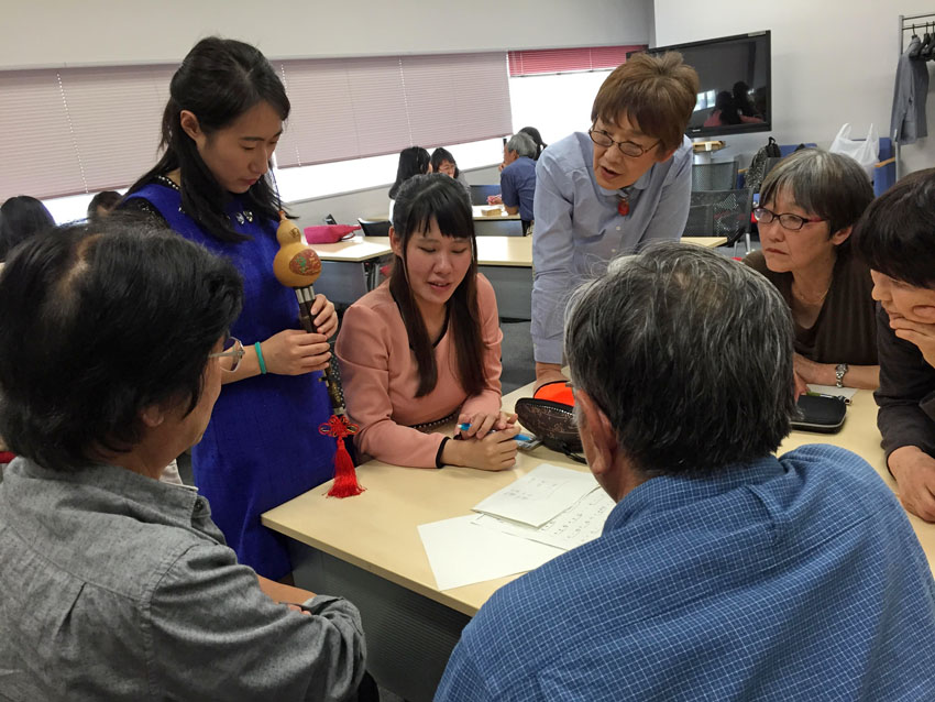 接着,孔院教师李西子为学员们吹奏葫芦丝,并介绍葫芦丝的演奏方法。学员们时而沉醉在优美的《月光下的凤尾竹》下,时而随着日本人所熟悉的《甜蜜蜜》的乐曲一起哼唱。演奏结束时,学员们很好奇地传看葫芦丝,并纷纷用汉语提问,现场气氛十分热烈。随后,大家还与札幌大学的中国留学生,就中国民族乐器的话题用汉语分组进行交流。