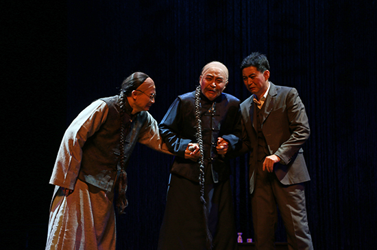 哀乐声起,雪花纷飞,康有为的灵柩被慢慢抬了出来,在舞台的蓝光映衬下格外凄清。康有为的去世令梁启超格外心痛,得知老师去世前仍惦记十年前的那句“世有康梁,再无康党”,愈加责备自己。梁启超的内心与康有为的灵魂之间的对话让我们真正进入他们的内心,感受着他们对互相的理解包容和那颗不变的爱国心。