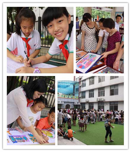 游园活动的同时,操场上摆起了100米长卷。一至六年级的学生在美术老师的指导带领下认真绘画。他们充分发挥想象力,用手中的画笔描画出了宽敞、崭新的家,快乐的生活跃然纸上,还有的小朋友画出五彩缤纷的学校,旁边是棵棵大树,上面结满了累累的果实,充分表现出一片富足与充实。