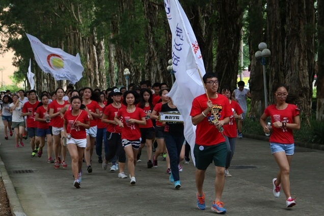 本次环校跑以学院为单位,跑步路线途经教学楼、图书馆、文化广场、体育场、报告厅等与师生学习生活密切相关的场所,“加油,不要放弃,你一定行的”,“再坚持一下,终点就在前面了”。除了言语上的鼓劲,还有些男同学甚至缓下步子等待团队里体力渐渐不支的老师和女同学们。这股支撑着他们在酷热的天气里坚持完成两公里环校跑的精神力量,充分地展现了广外人高度的集体荣誉感和凝聚力。奔跑结束后,许多同学都大汗淋漓。一名同学表示:“虽然很累,可是很好玩,以前从未觉得学校那么大,环校跑比单纯跑操场有趣多了。”她还表示,如果以后还有环校跑,她一定还会参加。