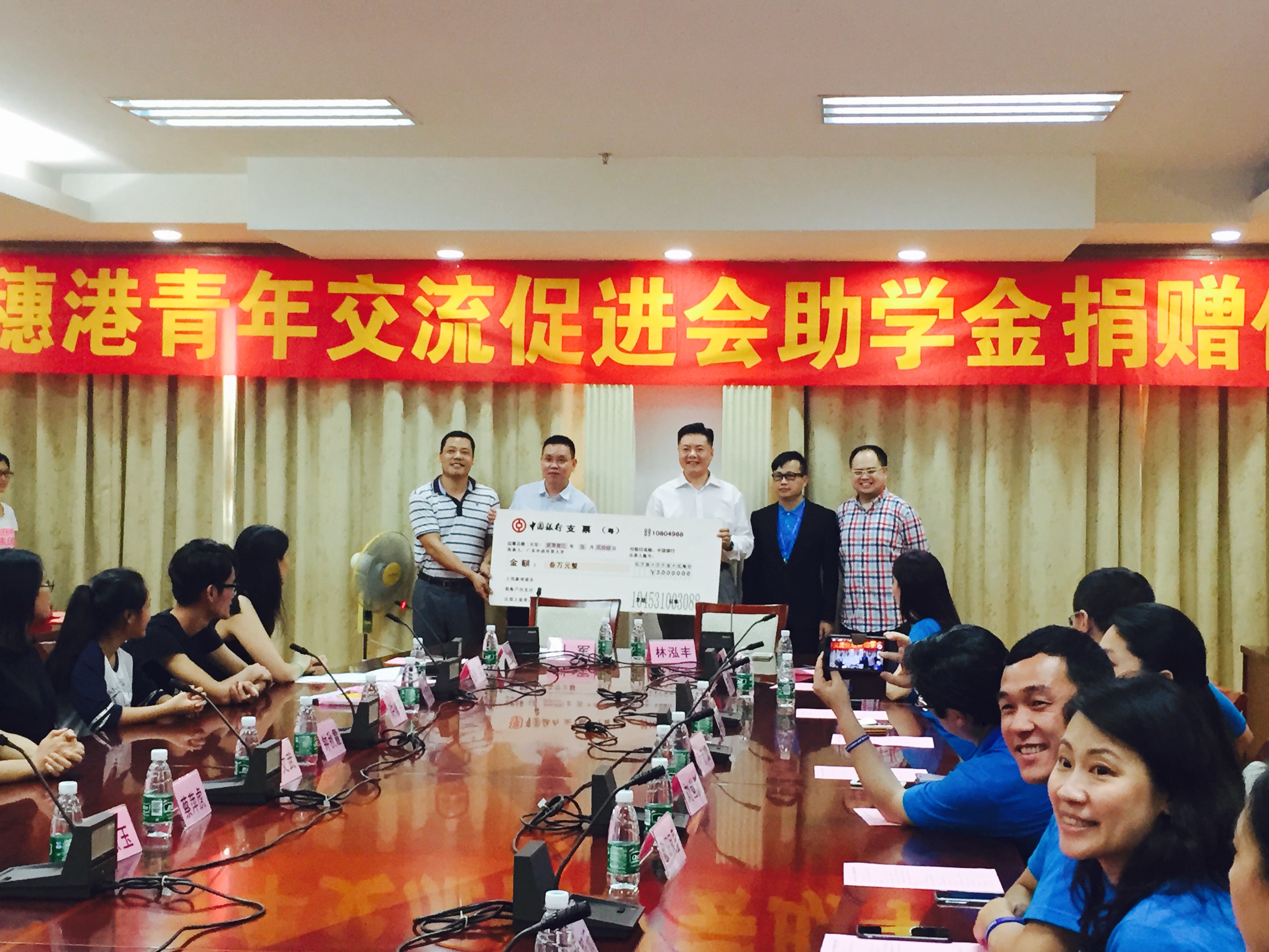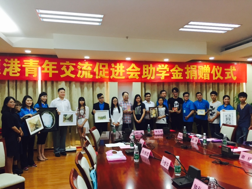 本网讯 5月24日下午,2014-2015穗港青年交流促进会助学金捐赠仪式在伟德bv国际体育南校区行政楼第一会议室举行。穗港青年交流会会长林泓丰、副会长陈龙盛、谢棓以及香港亚洲青年协会理事长黄喜润等一行27人出席了仪式。伟德bv国际体育学生工作处副处长刘军、艺术学院副院长李志刚、党总支副书记张莉参加了仪式。仪式上,10名艺术学院的学子接受了资助。