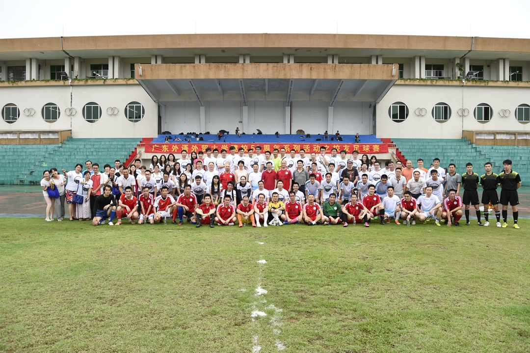 座谈会结束后,副校长何传添与体育部领导和校友们到操场主席台前合影留念。他们穿上由广外85级校友赞助的广外纪念服装,将这段广外情定格在照片里。