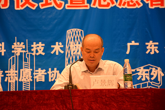 在奏唱国歌之后,卢景辉讲话。他首先向到场的志愿者们表示欢迎。卢景辉说,伟德bv国际体育一向重视志愿服务工作,此前组织近万名志愿者参加了多次大型赛会服务工作,如上海世博会、广州亚运会、深圳大运会等,都取得了优异的成绩,服务工作受到各界的好评。谈到这次即将在广州举行的中国科协年会,卢景辉勉励在场的志愿者们要“全力做好准备,积极投身实践,以专业的水平和热情的服务,履行好志愿者光荣的使命。”同时卢景辉还寄语志愿者们,希望同学们在志愿服务的过程中勇挑重担,锤炼品行,开阔视野,展现大学生的良好风采。