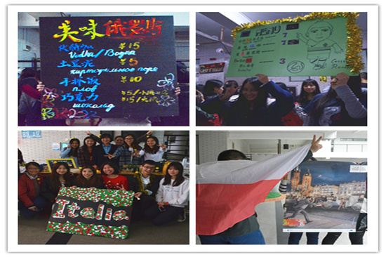 文化节上有同学们精心制作的食物饮料,以供参加开幕式的来宾朋友们享用。不同摊位的食物各具特色,如法语系的红酒冻,德语系的啤酒香肠,葡萄牙语系的特色蔬菜汤,俄语系的伏特加等。诱人的菜肴,以及同学们卖力的宣传,使整个欧罗巴开幕式现场气氛火热。