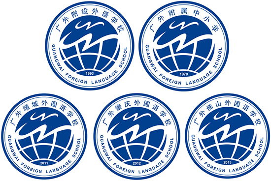 新徽标整体色调以蓝白色为主,寓意波澜壮阔的海洋,代表着远大的志向、谦逊的性格以及海纳百川的宽广胸怀。标志的上半部分的图形是两个字母“W”的变形,既代表了“广外”的“外”字,同时也像两只海鸥的形象,体现了附(设)属学校在大学的品牌之下跟随大学共同进步追求梦想的愿景。标识下部分以地球的形象表现,既体现了对大学校徽的继承性,又体现了学校国际化的办学特色。
