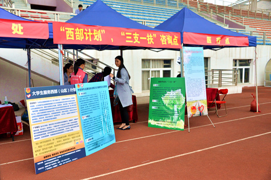 为了响应国家号召,校团委和学生就业指导中心在今年的招聘会现场还专门设立的“西部计划”、“三支一扶”项目咨询点,鼓励大学生到西部就业、到基层就业,在祖国的最需要的地方建功立业。