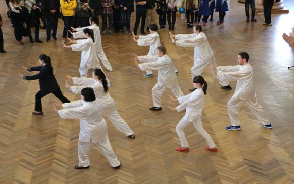 由叶卡当地华人留学生身着传统服饰编排的传统扇子舞,再一次引起全场的掌声。接下来,孔子学院教师带领学员表演了中国传统太极拳。柔慢而又铿劲的太极,在体型高大、金发碧眼的俄罗斯人一板一眼地演绎下让人忍俊不禁。而中国传统艺术——书法,吸引了相当多人的兴趣,大家提出的问题也五花八门。最后,学包中国饺子达到了本场活动的最高潮。饺子对于俄罗斯人来说,并不陌生。但是五花八门的俄罗斯饺子在中国人看来却是“难以忍受”的。品尝中国饺子让成日里吃惯了土豆泥、奶渣、甚至是樱桃馅饺子的俄罗斯人增长了见识,也让他们对中国文化产生了更直观的认识。