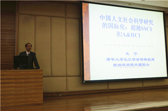 王宁开宗明义地指出了中国人文社会科学面临的紧迫的国际化任务,并介绍了中国人文社会科学工作者走向国际的几个途径:1)在国际重要的学术期刊发表学术论文;2)在国际知名的出版社出版专著;3)积极参加国际学术组织活动。随后,他介绍了“SSCI和A&HCI期刊评价及写作策略”,主要围绕三大方面:国际三大数据库简介、SSCI和A&HCI评介及我们的对策、主要国际学术期刊评介(哲学、语言文学和文化研究类)。王宁认为,对人文社会科学学者的国际学术地位的评价,应该从他/她所担任的国际学术组织职务、出席国际学术会议并作大会发言、担任国际权威学术期刊的编委或顾问着手。最后,王宁教授对中国人文社会科学研究的国际化战略提出了三点看法:1、要组织学术造诣深厚且英文写作好的学者集体攻关,力争在公认的国际权威刊物上发表原创性论文,并使有分量的学术专著跻身国际权威性的出版社。2、要培养一支高水平的学术翻译队伍,通过与国外学者的合作,将中国人文社会科学的优秀成果译成英文,在国际学术刊物上发表或在国际权威出版社出版。3、要努力打造中国人文社会科学的精品刊物和精品出版社,绝不以盈利为目的,力争在今后的五年内,向汤森路透科技信息集团推荐100种SSCI或A&HCI来源期刊。