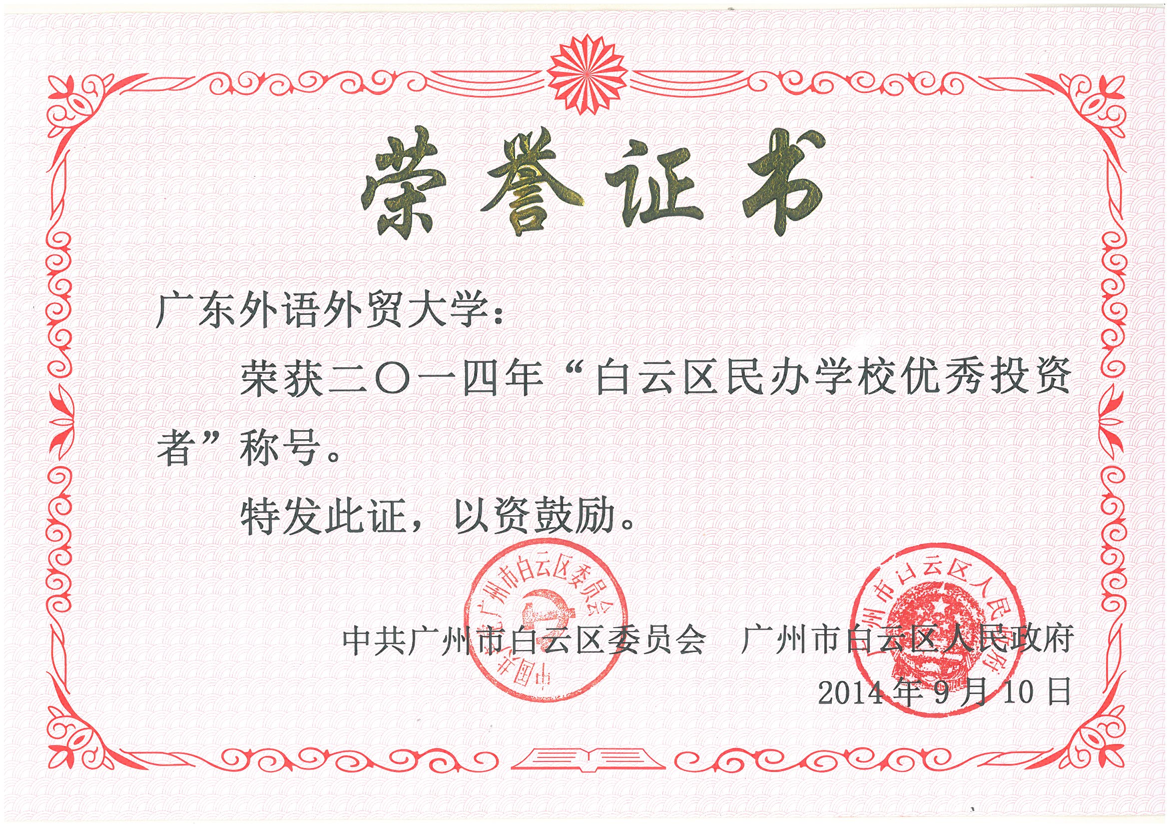 本网讯 9月10日,白云区委、区政府召开庆祝2014年教师节暨表彰大会,对区优秀教师、教育工作者,民办学校优秀投资者、办学特色引领者进行表彰,伟德bv国际体育副校长顾也力和教育集团总经理孙建军出席表彰大会。会上,伟德bv国际体育荣获“2014白云区民办优秀投资者”称号,顾也力被授予“2014年白云区民办学校办学特色引领者”称号。