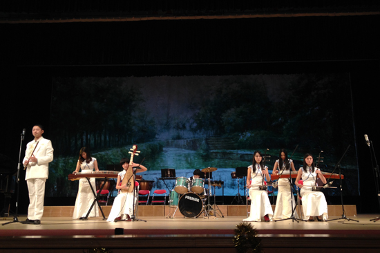 随后迎来了校管乐团木管小组的独家Show。一曲捷克名曲《幽默曲》明朗愉快,仿佛在舞台上演一幕滑稽戏谑的喜剧。在领略了众多西洋乐曲后,身着青花瓷旗袍和中式长袍的演奏小组一登场就令人眼前一亮。一曲中国传统名曲《梅花引》中琵琶、古筝、二胡和横笛萦绕交错,眼前仿佛出现“一枝梅花踏雪来,悬崖上独自开。”的情景。爵士鼓声响起,中西结合的方式,又带来一股江湖义气,侠客天涯的劲风。中国传统音乐与西方乐器的结合,让听众耳目一新。