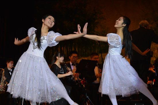 整场音乐会的压轴曲目《音乐之声》由“音乐老顽童”汤广再次登场指挥。这首人人传唱的经典电影曲目清新雅致,幽默有趣。随着汤广有力到位、激情洋溢的指挥,乐曲起伏不断。随着活泼有趣的音乐,校舞队的一对双胞胎舞者身着白色短裙出场,再现了电影里教师玛利亚的欢乐舞蹈场景。