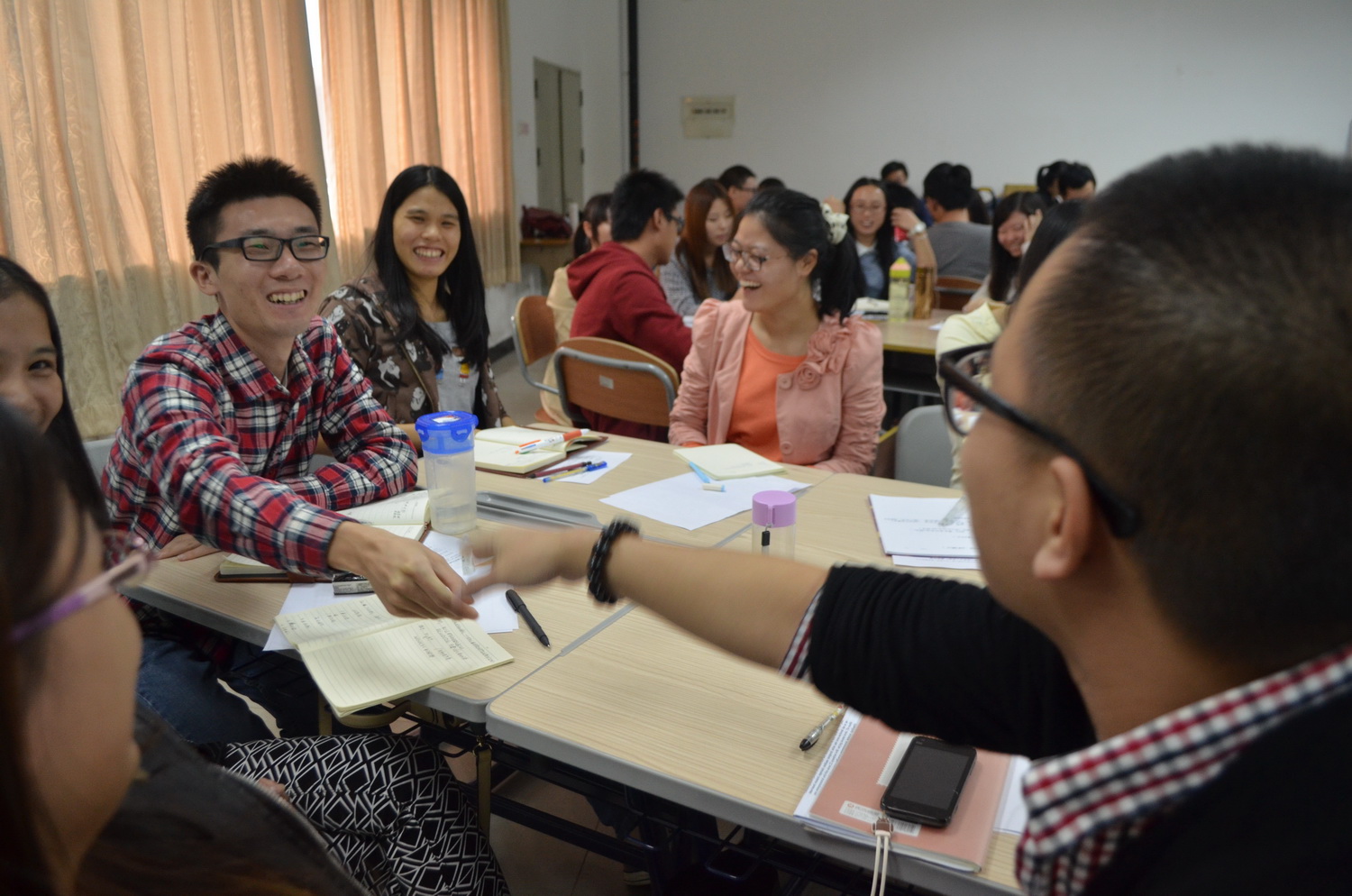 在讲授过程中,她采用互动式教学的方式,带领同学们进入角色,领会职场礼仪。她同时穿插了抢答环节,同学们积极回答。小组内的团结协作,小组间的良性竞争,为课堂增添不少欢笑。