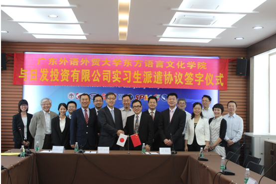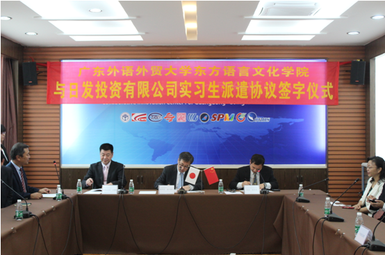 本网讯 10月28日,东方语言文化学院与日发投资有限公司(日本)实习生派遣协议签字仪式在北校区第五教学楼办公室举行。东语学院院长陈多友、党委书记敖湘晖、副院长丁国旗,日发公司专务嘉户广之及及两公司总经理大泽润和吉田晓等出席了本次签约仪式。