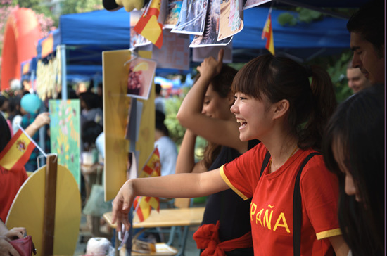 除了献出本国特色美食,留学生们还纷纷使出“绝招”吸引眼球。乌兹别克斯坦、吉尔吉斯斯坦和秘鲁的留学生在校道上载歌载舞,热情洋溢的舞蹈伴随着欢快的民族音乐,吸引了大量的路人围观并拿出手机拍照;西班牙帅哥在摊位“叫卖”三元一枚的香吻;俄罗斯芭蕾舞女摆出各种舞蹈动作,不断有同学过去跟她合影;身穿日本传统服装和服的日本女孩手拿摊位宣传牌,在校道上来来去去;泰国留学生同不太流利的中文向每个前来品尝美食的同学说“告诉你们的朋友来”……