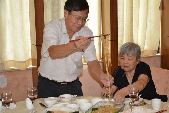 席间,仲伟合代表学校党委和校领导向寿星们致以生日的祝福,感谢他们为祖国教育事业所作出的积极贡献。他说:“学校今天的发展与寿星们的努力打拼所奠定的基础是密不可分的。”陈建平还给每位寿星装上一碗长寿面,祝寿星们健康长寿。最后,仲伟合与陈建平一起向寿星们敬酒,给寿星们送上大红包,与寿星们合影留念。