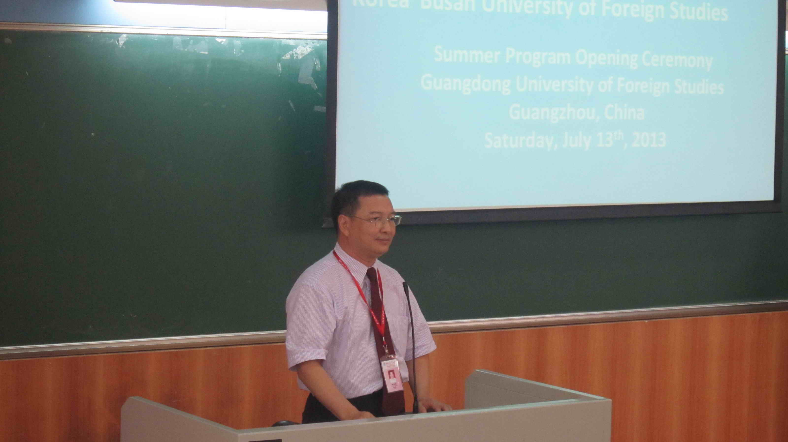 梁学宏致辞,他表示本次开营仪式将会有汉、西、俄、韩的四语翻译,虽然仪式持续的时间会比较久,但能让大家真实地感受到广外浓厚的国际化氛围。随后,他为在座的师生介绍了学校、学院以及广东省和广州市的发展情况。最后,梁学宏感谢了四所高校的领导为文化交流所作出的努力,并希望研修团的学生能够更加积极主动地去学习和交朋友。