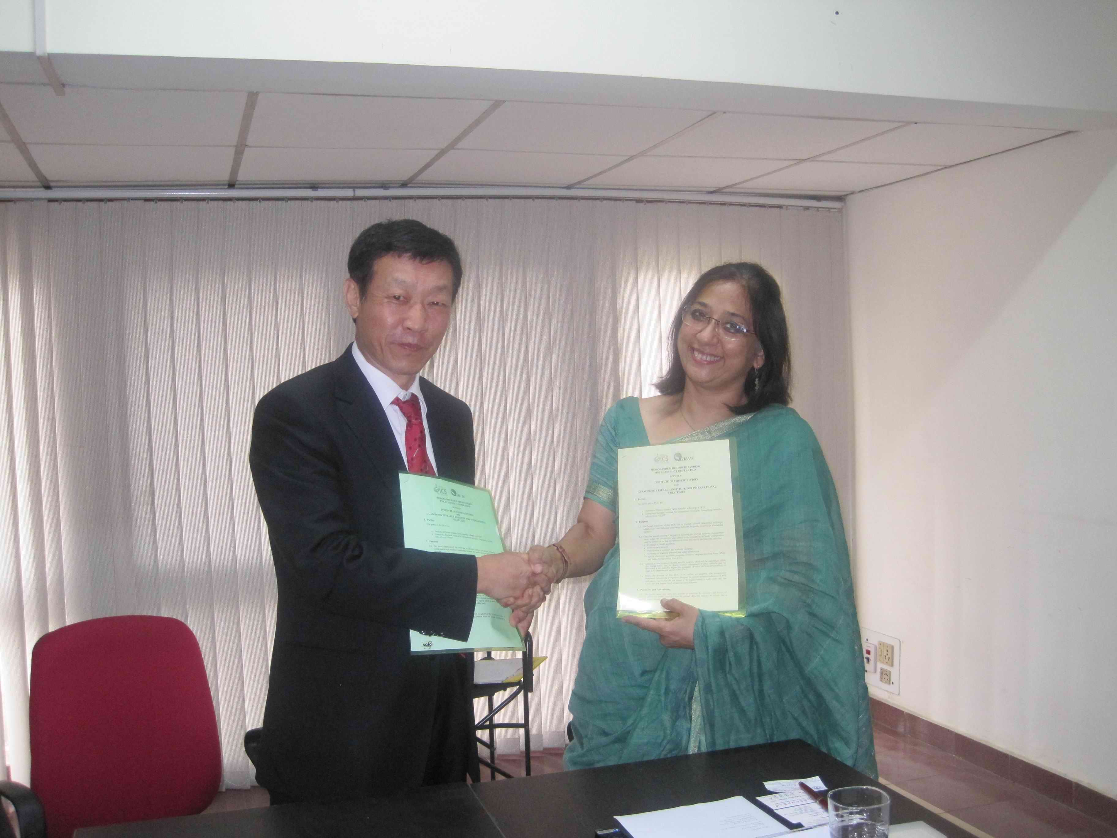 6月18日,许国彬访问了印度中国研究院。研究院院长艾嫘伽(Alka Acharya )及邵葆丽(Sabaree Mitra)等多名研究员参加了会见和交流。许国彬对印度中国研究院富有影响的研究表示赞赏,提出愿意为研究院提供各种相关资料和信息。艾嫘伽提出该院愿与伟德bv国际体育广东国际战略研究院印度研究中心展开广泛的研究合作,共同为区域经济和社会发展做出贡献,双方还就具体的合作项目及合作计划进行了商议。随后,许国彬与艾嫘伽共同签署了合作备忘录。