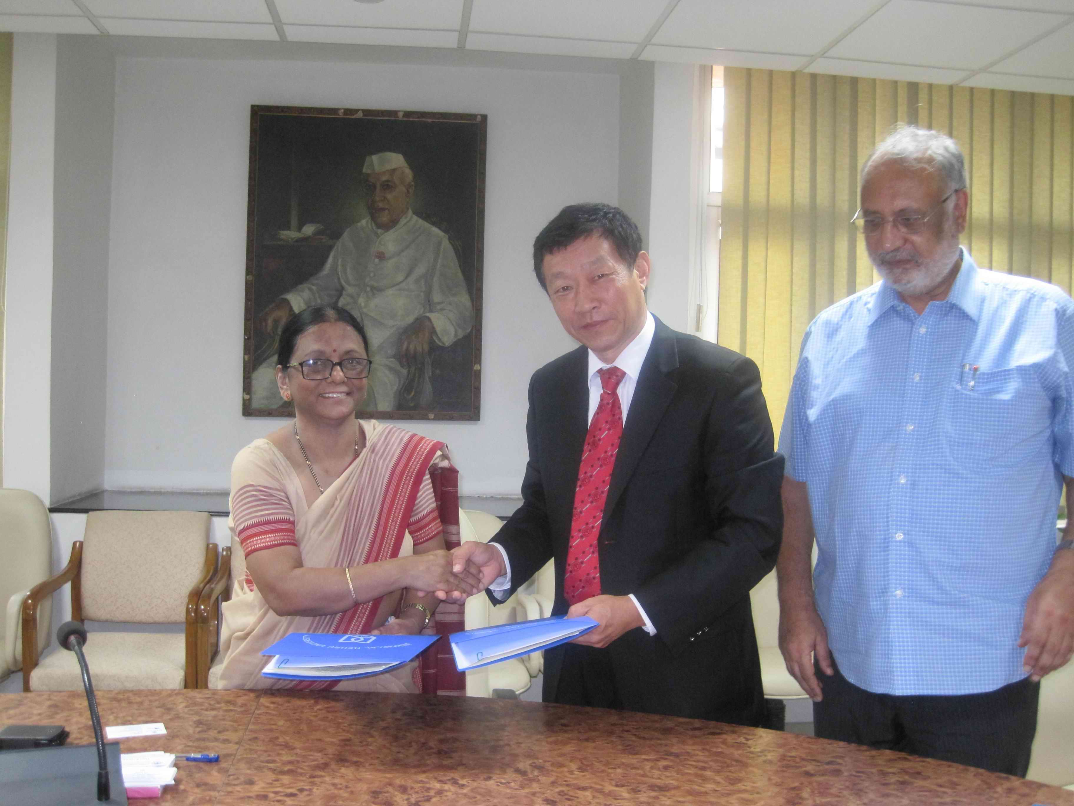 6月18日,许国彬访问了尼赫鲁大学。尼赫鲁大学校长苏塔·拜(Sudha Pai)欢迎许国彬一行的到来。尼赫鲁大学国际合作处首席顾问及区域发展研究中心哈尔吉特·辛格(Harjit Singh)、语言、文学与文化研究中心中国与东南亚研究院拉盖什·古马儿(Rakesh Kumar)、 加拿大、美国与拉美研究中心主任秦塔莫尼·玛哈伯德(Chintamani Mahapatra)等参加了会见。许国彬向尼赫鲁大学的领导和教授们介绍了伟德bv国际体育的发展历史、学科门类、专业特色及社会影响等情况。双方在合作办学、学生交换、信息共享、合作研究等方面达成了多项共识,并就具体的合作项目进行了商议。随后,许国彬与苏塔·拜共同签署了两校合作协议。