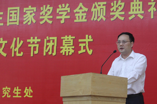 朱文忠宣读《关于表彰2011-2012学年度“研究生国家奖学金”获得者的决定》、《第八届研究生学术文化节优秀指导老师、优秀学生个人的名单》。石佑启和院领导为获奖研究生颁奖。