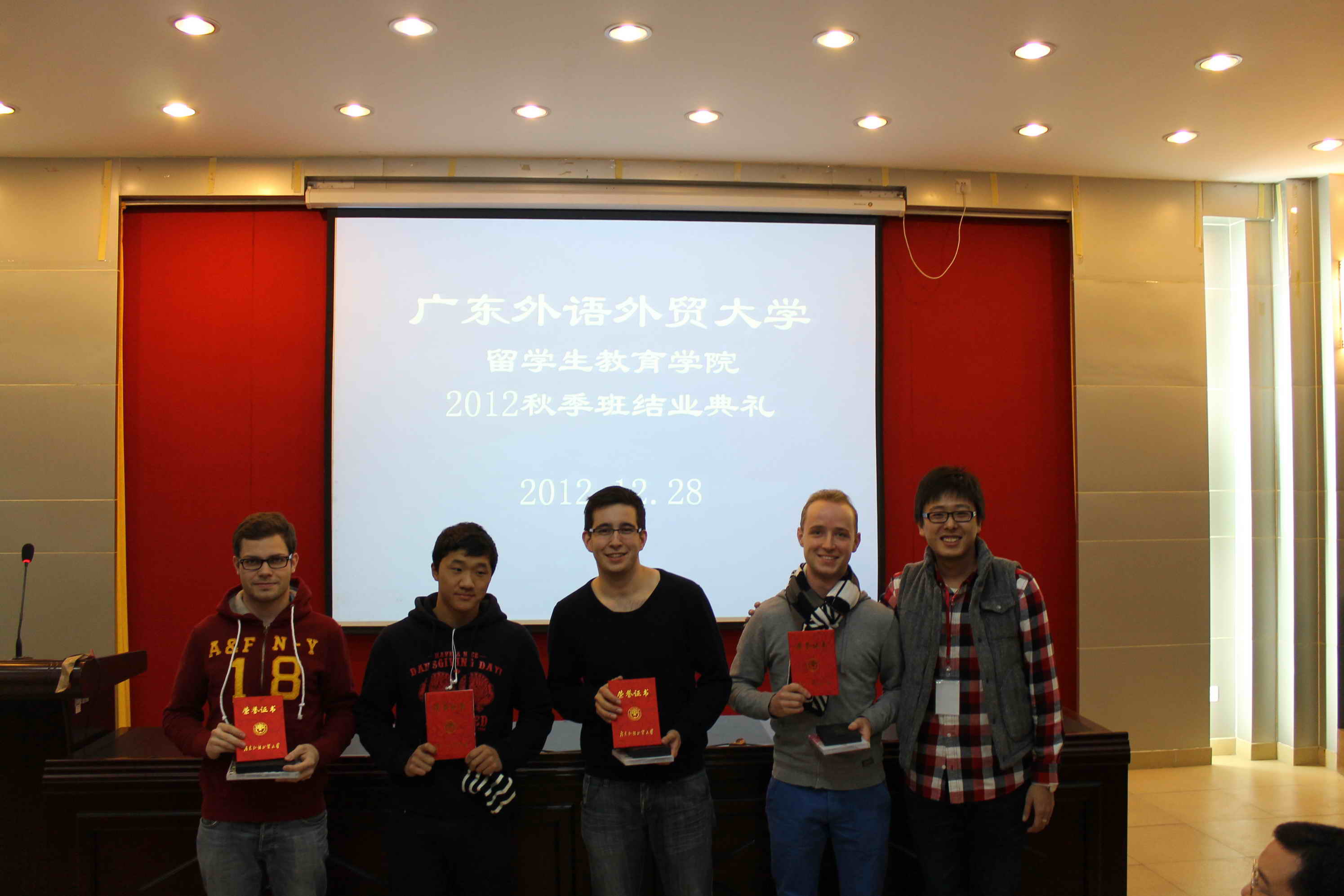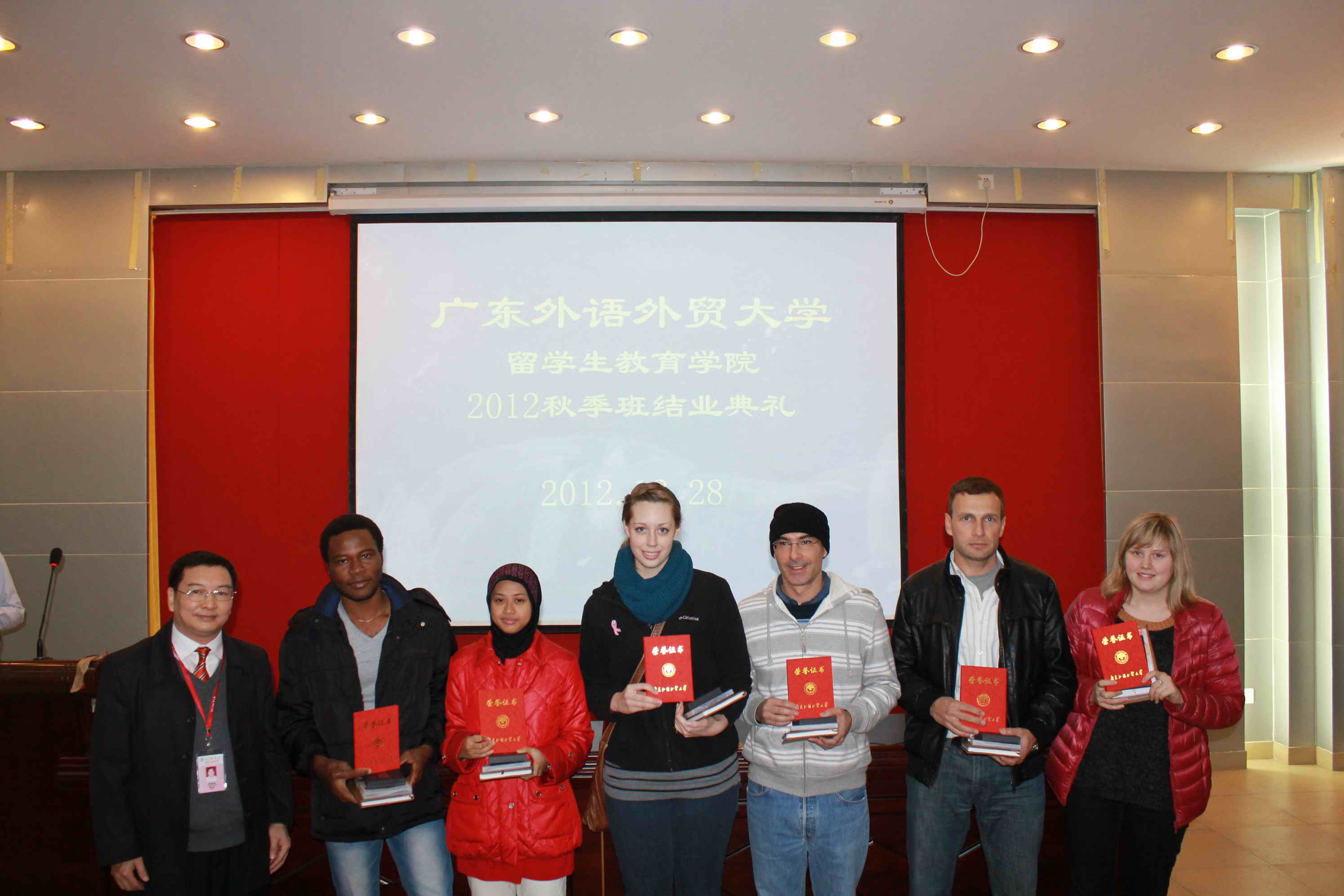 年12月28日,伟德bv国际体育,BETVICTOR官网留学生教育学院2012秋季班结业典礼在第七教学楼106室隆重举行,学院师生共同出席了此次典礼。