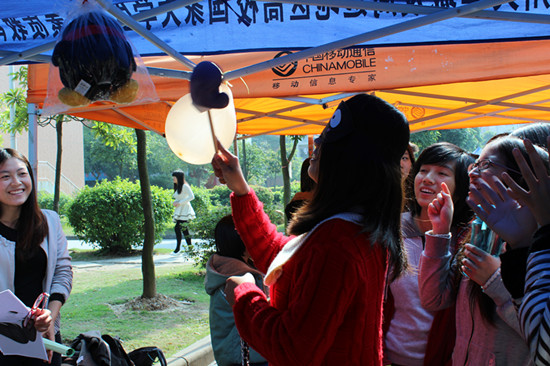 绕场一周,只见税务1102党支部别出心裁地为同学们提供眼镜清洗服务,ACCA党支部为同学们的自行车打气,11财管党支部则以积分换奖品的形式让同学们在游戏中重温童年的乐趣,审计1101党支部还手把手现场教同学们编织各式温暖的围巾……刚参与完11会计、财政党支部的“蒙眼画像”游戏的一位同学笑着说:“这种游戏的形式很有趣,感觉党支部其实跟我们很贴近。”