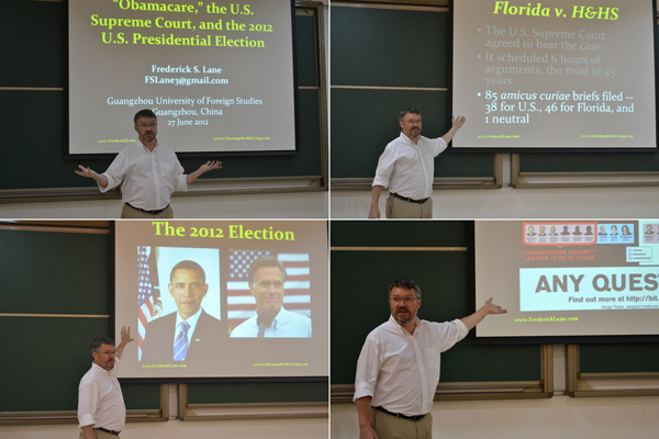本网讯 6月27日下午,英文学院学术沙龙主题讲座在七教213阶梯室顺利举办。在将近两个多小时的讲座中,主讲人美国律师、网络作家Frederick Lane为在场观众讲述了“奥巴马医改”、“美国最高法院的判决”和“2012年美国总统大选”三个时事主题并发表了个人的独特观点。美国富布莱特学者Amy以及各学院部分老师参加了讲座,英文学院老师冯蔚担任主持。