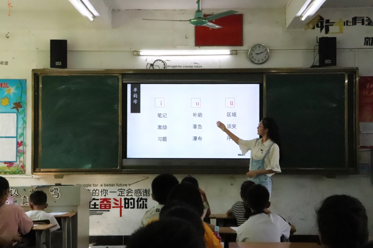 7月18日,是“声声不息”服务队实践活动的第四天。上午8:30,任课老师发放诵读材料,在课代表的带读下,学生们清脆而响亮的读书声在教学楼里久久回荡。基于当地实际情况,教学组对学生进行有针对性的教学。普通话正音课上,任课老师通过字词发音练习,将教师示范与学生朗读结合,并在朗读过程中指导学生正确的发音部位和发音方法。课上的绕口令环节具有纠正字音、锻炼口齿的作用,同时增强了学生的学习乐趣。