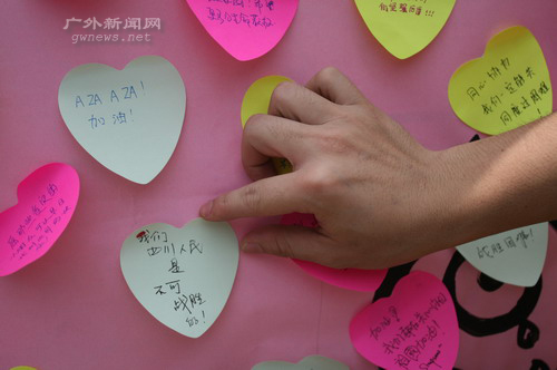 英文学院05级的高同学来自成都,她同样表示,在募捐当天,当她看到广外附小的小学生纷纷掏出自己的零花钱,认认真真地为灾区的小朋友写上自己最真诚的祝福的时候,当她看到一位清洁工阿姨从口袋里掏出一把皱巴巴的钱毫不犹豫地抽出那张面值最大的100元投进了募捐箱的时候,她心中的感动之情油然而生。