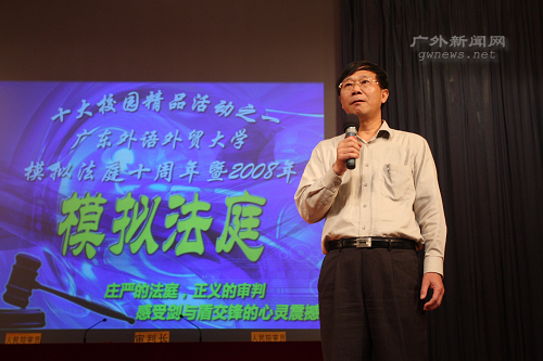 本网讯 5月14日晚,由校党委宣传部和法学院主办的广外大十大精品活动之一——“模拟法庭十周年庆典暨2008年模拟法庭”于南校区B8学术报告厅隆重举行。