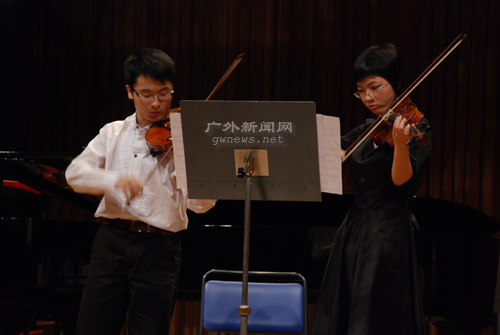 在表现人物由伤心到惊喜的感情变化时,小提琴独奏陈进先以查尔达什舞曲低沉哀伤的曲调来表现人物心中的悲伤。紧接着,曲调变得越来越明快,轻快舒畅的曲调流露出人物的欢喜,渐渐地全场都沉浸在愉悦欢乐的音乐当中,他纯熟的演奏技巧将人物内心的感情变化表现得淋漓尽致,赢得了台下观众热烈的掌声。