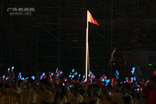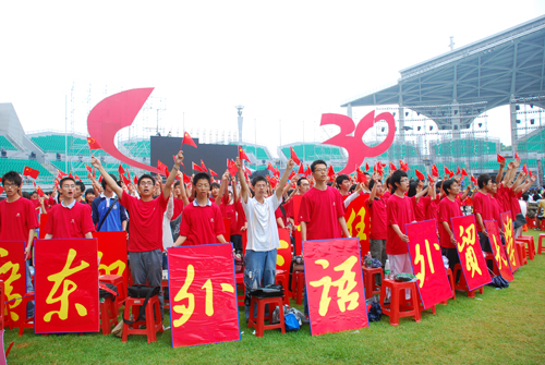 方阵队成员身穿红色上衣,手拿红旗,高举“励志行知天下,责任成就未来”的字牌,以一首《我们年轻人》回敬了中大的“挑战”。拉歌过程中,“广外唱一唱,吓得华师变了样;广外吼一吼,吓得华师抖三抖”,幽默的语言,加上整齐的动作,嘹亮的歌声,一瞬间成为全场的焦点。
