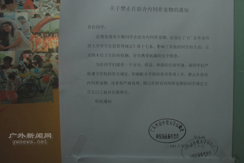 宿舍楼下贴出“关于禁止在宿舍内饲养宠物”的通知