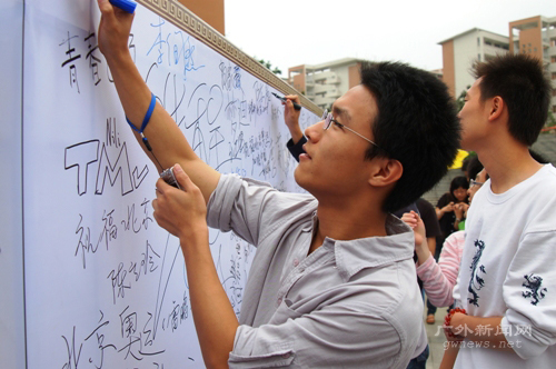 当日,主办方还准备了巨大的横幅供学生签名,支持奥运。同学们争先恐后地写下对奥运最真挚的祝福,寄语很快就密密麻麻地填满了整个横幅。活动中还现场招募奥林匹克文化传播使者。