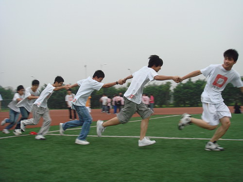 首先开始的真人版“贪食蛇”比赛让同学们过了一把“奔跑”瘾。 每队12人分成四组,每次出场3人,绕过障碍物后再回来拉下一组继续跑,以此类推,队伍不断壮大,直到所有人一起奔回起点。在整个奔跑的过程中,队员们必须始终手牵着手,即便手被拉疼也不能松开,让大家体会到了真正的“不抛弃,不放弃”。