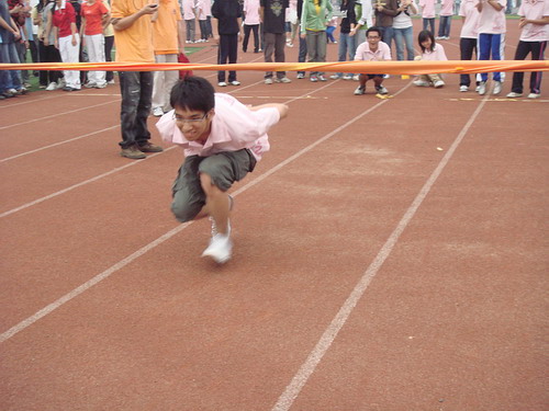 “蹲走前行” 接力赛要求队员们蹲着依次相向快速穿过标准线。 由于没有经过训练,起初大部分同学都会“触线”。但经过赛前的几次尝热身,他们都很快进入状态,弯腰蹲着前行也能跑得灵活自如。