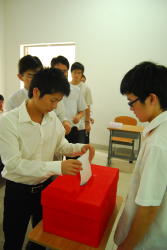 在听取主持人介绍完六位候选人后,选举正式开始。各位党员陆续投放填好的选票。总监票人王金矿带领工作人员在F214室点票。十分钟后,选举结果揭晓。曾智鹏作了总结发言。