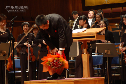 演奏结束后,杨洋带领众演奏家向观众致谢。他表示很愉快为广外的师生演奏这场音乐会,也希望大家常来星海音乐厅聆听交响乐。