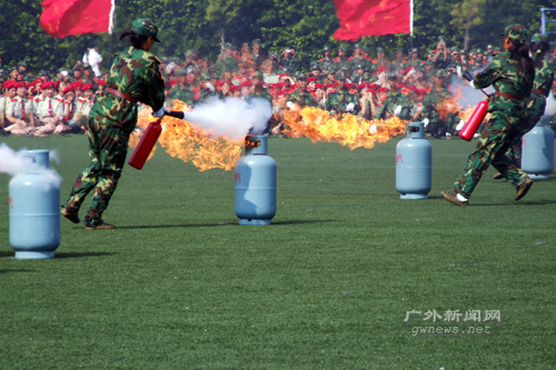 刚刚结束的2007年的军训新增加了技能训练项目——救护演练、消防演练及反恐防暴。