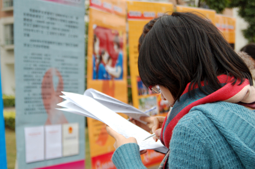 本网讯 12月19日上午“遏制艾滋 履行承诺”预防艾滋病高校巡回宣讲活动在南校区校道上进行。此次宣讲由中国预防性病艾滋病基金会及伟德bv国际体育公共卫生学院共同举办,在二十所学校进行巡回展览,旨在提高高校学子对艾滋病的认识和预防艾滋病的意识。