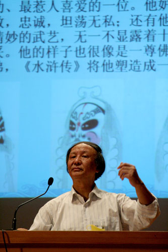 马教授解释道,得出这样的结论主要依据在于《水浒传》所描述的文化背景的细节描写,包括人物所使用的语言,所居住的建筑物风格等的描绘上,必须是处于宋元时期的作者才能还原出如此真实的场景,这是相隔较为久远的明朝时期的作家所无法达到的一种境界。因此,历史上《水浒传》孕育于宋代,在元朝时期已形成若干独立话本和章回小说,书中的核心部分为宋元时期所编撰,明朝时期对《水浒传》的贡献只是“狗尾续貂”。马教授的论述有理有据,引起台下观众的共鸣。