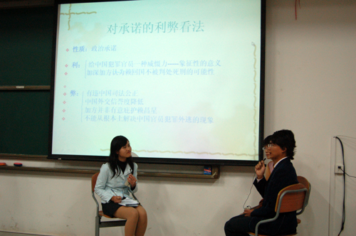 “这里是思想的圣殿,这里是学术的殿堂”9号组合“三叶草”模仿“世纪大讲堂”的节目形式,分析了震惊世界的远华走私案中有关赖昌星遣返问题。小组成员中对所涉及的中加法律、外交和国际政治冲突问题的精彩分析引起了到场同学的广泛好评。其中大讲堂“主持人”06国际政治学的王娟同学自信大方的主持风格更是给观众留下深刻印象。