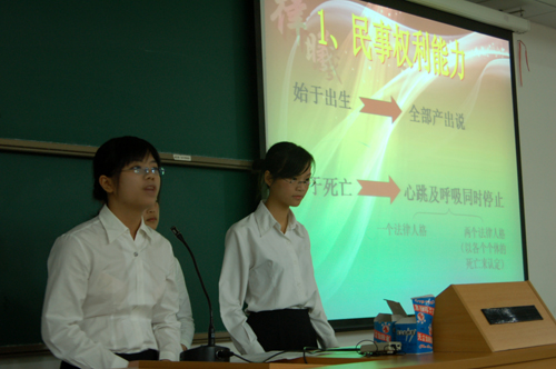 06法学组合法之翼和07法学组合慎独·笃行的选题都是“史上最牛钉子户”,该问题涉及《物权法》中众多有争议条款,有不小的分析难度。但是,慎独·笃行队伍两位男生开场生动形象的短剧掀起了一个小高潮。紧接着他们分析了《物权法》出台前后房屋产权的法律意义,还有法院与政府的关系等,并讲述了“钉子户”事件的在立法、司法和执法三方面的启示。1号组合侧重分析了条款中涉及各方利益的部分以及《物权法》对于维护“维护私人利益不可侵犯”的原则的进步意义。而12号组合法之眸则从《物权法》中“善意取得制度”的要件分析中得出物权对维护公民权利的重要性。