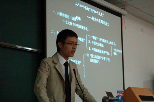 第二个出场的黄韬来自05国际政治学,他以独特的视角分析“中国从‘和平崛起’到‘和平发展’”。从“和平发展”被写进十七大报告的微妙变化说起,黄韬同学分析了中国应从“和平崛起”转变为“和平发展”,这是因为“中国已经和平崛起”及“中国的发展也将是和平的”。黄韬同学关于“中国和平崛起”问题的深刻分析,以及对“和平崛起”和“和平发展”两个概念的全新阐释,博得了观众们热烈的掌声。
