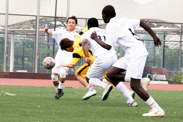 在双方的拼抢中,留学生队凭借身体上的优势,占了不少便宜。不仅依靠身体条件在高空球的控制上占优,脚下技术也十分出色,这让管理防守起来颇感吃力。尤其是场上的几名非洲裔球员,启动速度快,在一对一对话时都令管理后防线头疼。不过,尽管场上队员个人实力不俗,但留学生队整体的组织结构则显得比较凌乱。没能打出团体的配合,而只能依靠个人的技术和速度优势在7人制小场地上反而成为了他们的短板。
